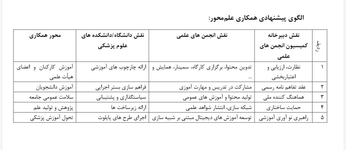 برگزاری مدرسه تابستانی مشترک سلامت عمومی برایدانشجویان با حضور اعضای انجمنهای علمی، ایجاد کلینیکهای مهارت آموزی (Skills Lab) با با همکاری انجمنهای تخصصی و بر اساس استانداردهای WONCA وWFME، راه اندازی سامانه ملی آموزش مداوم CME با مشارکت انجمنهای علمی، مشابه مدل European CME Accreditation، استفاده از ظرفیت انجمنهای علمی در فرایند ارتقاء اساتید وبرنامه های توسعه حرفهای مداوم(CPD) و همکاری انجمنها در طراحی و اجرای برنامههای نوآوری آموزشی، آموزش مجازی و تحلیل دادههای سلامت ((BIG DATA برای ارتقای تصمیم گیری مبتنی بر شواهد.